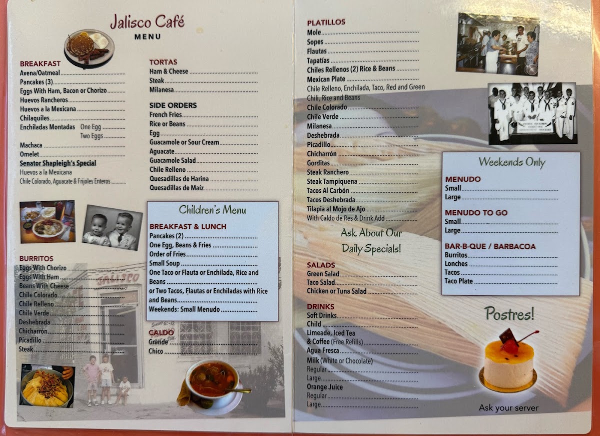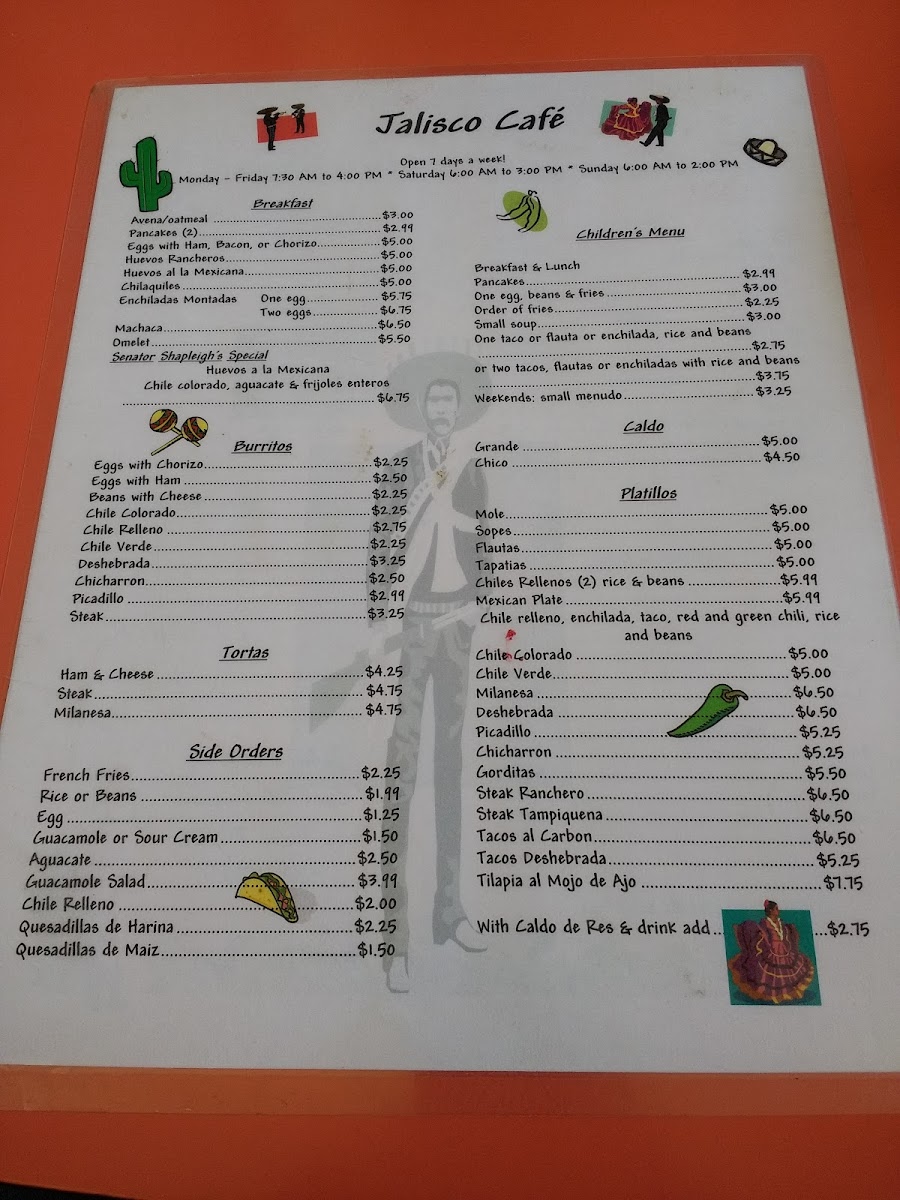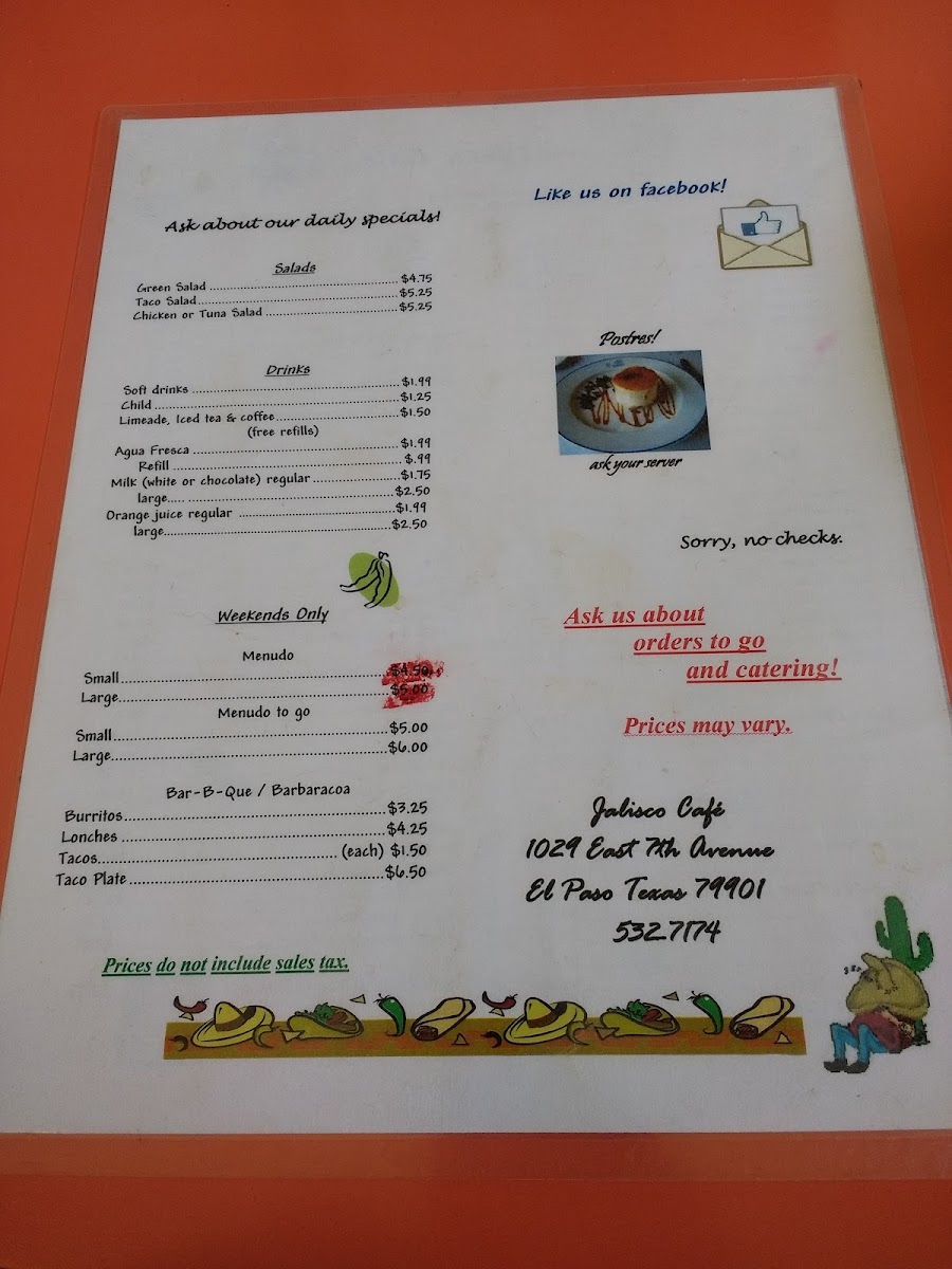 Welcome to Jalisco Cafe, your go-to destination for authentic Mexican cuisine in El Paso. Nestled at 1029 E 7th Ave, this cozy eatery prides itself on serving delicious, home-cooked meals that make you feel right at home. With an array of options, the menu showcases delightful dishes like the renowned menudo, praised for its rich flavor and hearty portions, making it a local favorite.